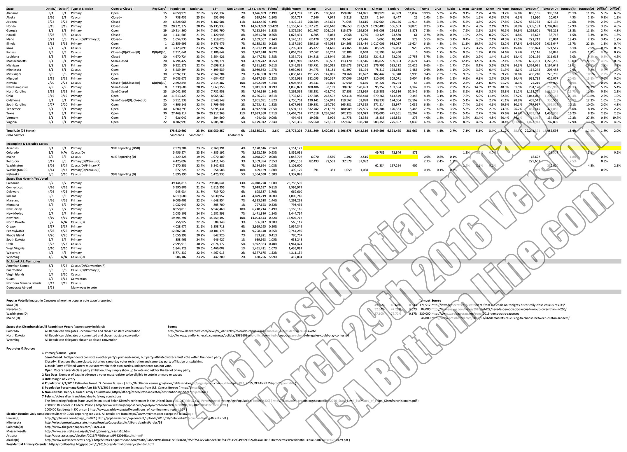24 States Excluded + DC — This study has included the 26 states where both parties have voted and 100% of the vote has been tabulated. Where are the results from the Maine Democratic Caucuses? It's been over three weeks and still the Maine Democratic Party has only reported 91% of their results. For this reason, Maine is excluded from the above analysis. Likewise, it's been over three weeks and the Nebraska Democratic Party has not yet reported 100% of their results, so Nebraska is also excluded. (Republicans also haven't yet voted in Nebraska.) The State of Arkansas has only reported results from 99% of their precincts (it's been 4 weeks), so Arkansas is excluded. In Kentucky, Washington State, and Washington DC, one party has voted but not the other. In 16 states, neither party has voted; but competition in these states is less meaningful as clear winners emerge. Last are three states we can't include in the analysis —